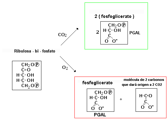 Si la concentración de CO 2 es baja, funciona como oxidasa, y en lugar de ayudar a la fijación de CO 2 mediante el ciclo de Calvin, se produce la oxidación de glúcidos hasta CO 2 y H2O, y al proceso se le conoce como fotorrespiración. La fotorrespiración no debe confundirse con la respiración mitocondrial, la energía se pierde y no se produce ni ATP ni NADPH; y como se ve en el esquema se disminuye el rendimiento de la fotosíntesis, porque sólo se produce una molécula de PGA que pasará al ciclo de Calvin; en cambio cuando funciona como carboxilasa, se obtienen dos moléculas de PGA.