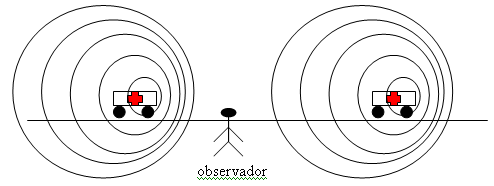 Tomemos por ejemplo la sirena de una ambulancia. Cuando se acerca, las ondas sonoras que se propagan hacia delante están más apretadas, y llegan a nuestros oídos con más frecuencia y la sirena tiene un tono más agudo. Cuando se aleja, las ondas que se propagan hacia atrás están mas separadas, de frecuencia más baja y el sonido es más grave. Cuanto mayor es la velocidad de la fuente de sonido mayor es el cambio de frecuencia.