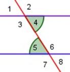 Esta distribución numérica nos permite carecterizar parejas de ángulos según su posición, haciendo notar que los ángulos 3, 4, 5 y 6 son interiores (o internos) y que los ángulos 1, 2, 7 y 8 son exteriores (o externos) respecto a las rectas:
