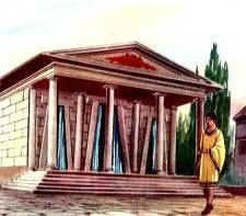 Las moradas urbanas estaban construidas según un plan uniforme: un vestíbulo, a menudo decorado con estatuas, que daba acceso, por una segunda puerta y un pasillo, a un patio bordeado de columnas, en el que se levantaba un altar consagrado a Júpiter; a ambos lados de este altar existían otros dos, consagrados a los dioses de la propiedad y de la familia.